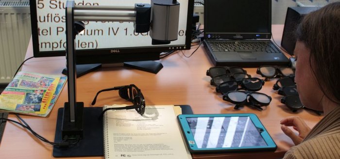 Mit dabei: Der Erlebnisparcours der Stiftung barrierefrei kommunizieren! Besucherinnen und Besucher der 10. Nürnberger Bildungskonferenz konnten zwischen den Workshops einige assistive Technologien ausprobieren, die Menschen mit Behinderung die Nutzung digitaler Medien und barrierefreie Kommunikation ermöglichen. Zum Beispiel Mund- und Kopfmaus als alternative Eingabegeräte für Menschen mit motorischen Einschränkungen, die iPad-Apps Metacom und Predictable als Beispiele für symbol- und schriftbasierte Kommunikationshilfen für Menschen ohne (verständliche) Lautsprache, Vergrößerungstechnologien für sehbehinderte Menschen. Außerdem wurde gezeigt, dass Tablets sich mittels Scanning auch mit externen Tasten bedienbar sind und damit prinzipiell auch von Menschen mit schweren Körperbehinderungen, wenn sie in der Lage sind eine Taste auszulösen. Spaß machte wie immer die Fahrt im Rollstuhlsimulator, eigentlich eine Trainingssoftware für Menschen, die die E-Rollstuhl-Steuerung lernen, aber immer gut, um über das Spiel gemeinsam ins Gespräch zu kommen über Inklusion und Medien.
