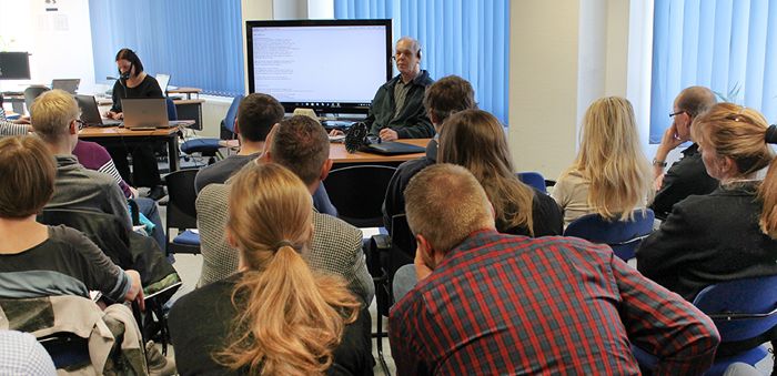 Los ging es mit einem Vortrag, wie moderne Technologien das Lernen behinderter Menschen unterstützen können. Hier wurde ein Überblick über mögliche technische Hilfen für Menschen mit Seh-, Körper-, Sprach- und Lernbehinderungen gegeben. Es folgte eine Präsentation der Firma AASB Seidling, die auf Hilfsmittel für blinde Menschen spezialisiert ist. Die Firma ist zertifizierter Vertrieb für die Spracherkennungssoftware Dragon Naturally Speaking und hat die Software für blinde Menschen angepasst. Herr Seidling, selbst blind, präsentierte eindrucksvoll, wie die Software auch blinde Menschen bei der Arbeit, z. B. beim Umgang mit dem Office-Paket und der Eingabe von Texten, wirksam unterstützen kann.
