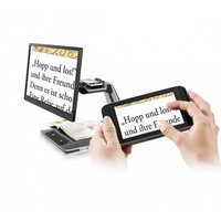 Hierbei handelt es sich um eine Basis-Station der mobilen Leselupe Prodigi. Diese wird an die Andock-Vorrichtung angebracht und gibt das bis zu 80fach vergrößerte Bild auf einem 24-Zollmonitor in Echt- bzw. 16 Fehlfarben wieder. Gleichzeitig wird die mobile Leselupe aufgeladen. Die Bedienung ist einfach und intuitiv über Touch-Funktion. Das Bild kann bis zu einer Seitengröße von A4 erfasst werden. Prodigi Duo enthält zugleich eine Vorlesefunktion, deren Geschwindigkeit einstellbar ist.Lesesystem mit Vorlesefunktion.