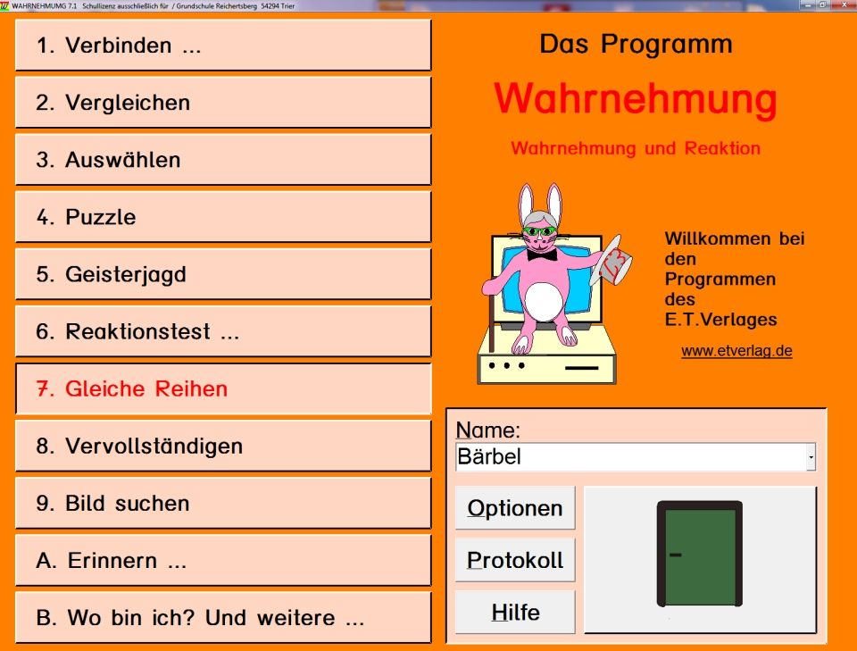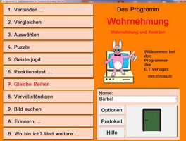 Verschiedene Trainingsmöglichkeiten zur visuellen Wahrnehmungsdifferenzierung, Förderung der Gedächtnisleistung, Koordinations-, Kombinations-, Logik-, Gedächtnis- und Reaktionstraining und vieles mehr. Die Aufgabenstellung kann von sehr leicht bis sehr schwer gewählt werden. Einsatzbereiche:- Förderschule / Grundschule / Kita