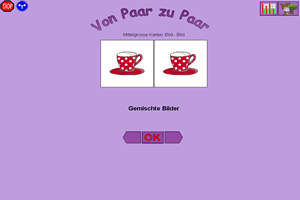 Von Paar zu Paar ist ein vielseitiges Memory-Spiel für alle Altersstufen. Viele Themenbereiche stehen zur Verfügung: Tiere im Zoo und in der Natur, Freizeit, Pflanzen, Instrumente und Musik, Lebensmittel, Fahrzeuge und Länderflaggen,... Es können Bild-Bild, Bild-Wort, Buchstaben-Zahlen, Farben-Formen, Flaggen-Land und Geräusch-Bild Zuordnungen geübt werden. Die Kartengröße sowie Anzahl der Karten sind einstellbar. Es kann Memory mit verdeckten Karten oder Paarbildung mit aufgedeckten Karten gespielt werden. Die Spiele sind auch per Taster (Scanning) zu bedienen. Ein Editor zur Erstellung eigener Materialien ist inkludiert. Einsatzbereich:- Spielen